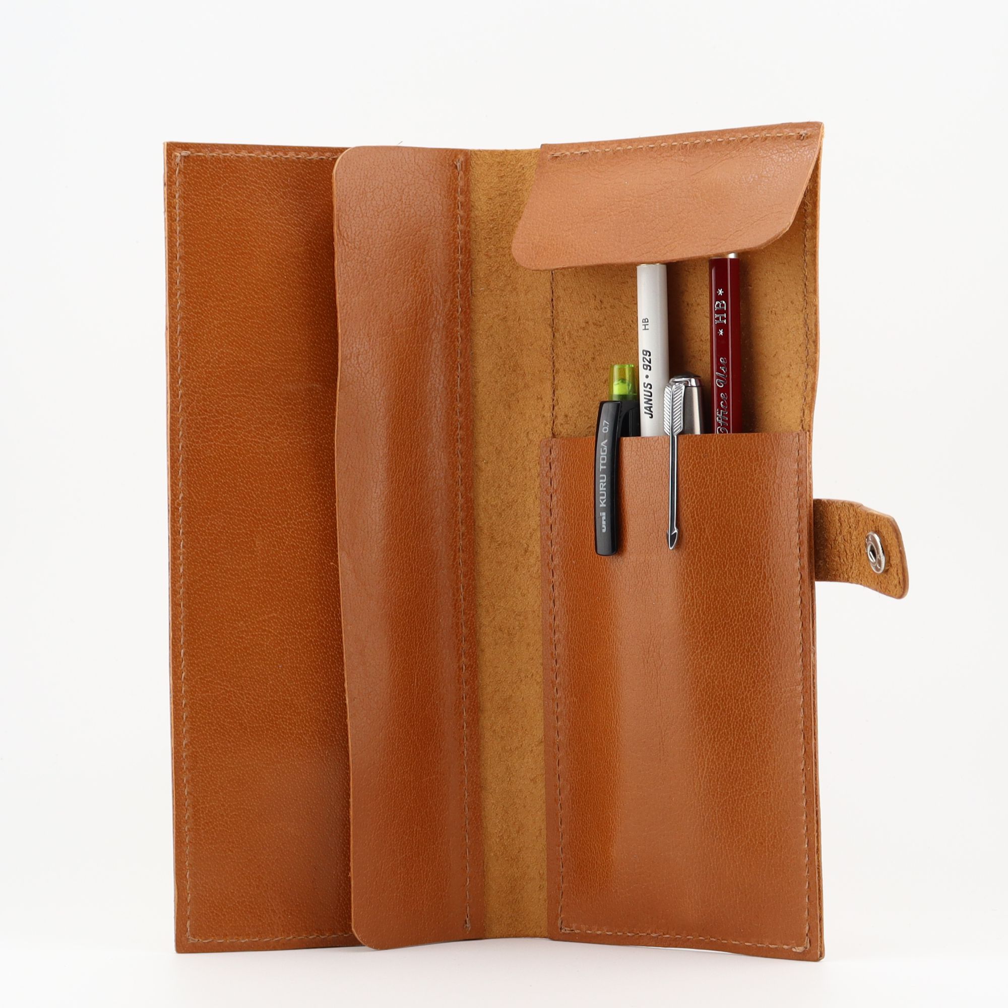 Protect your favourite pens and pencils in a durable folding leather case. This pencil case is specifically designed to actually fit wooden pencils as well as your daily essentials such as a ruler, eraser and small sharpener. The snap closure ensures that your favourite writing products are easily at hand. Hand cut, carefully sewed and hand edge finished. If properly cared for, this case should last you a lifetime.